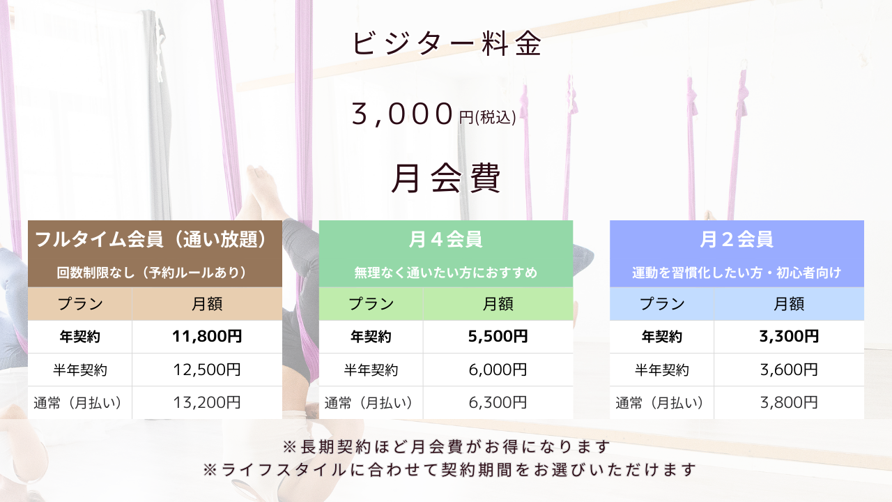 入会した月の会費は、残りの回数に応じた「日割り回数計算」となりますので、いつから始めても損をすることはありません。